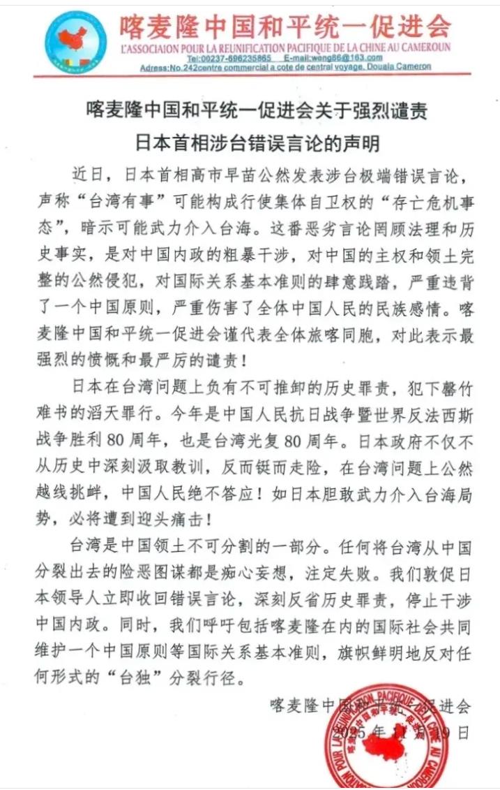 • 喀麦隆侨界强烈谴责日本首相高市早苗涉台错误言论 2025-11-26